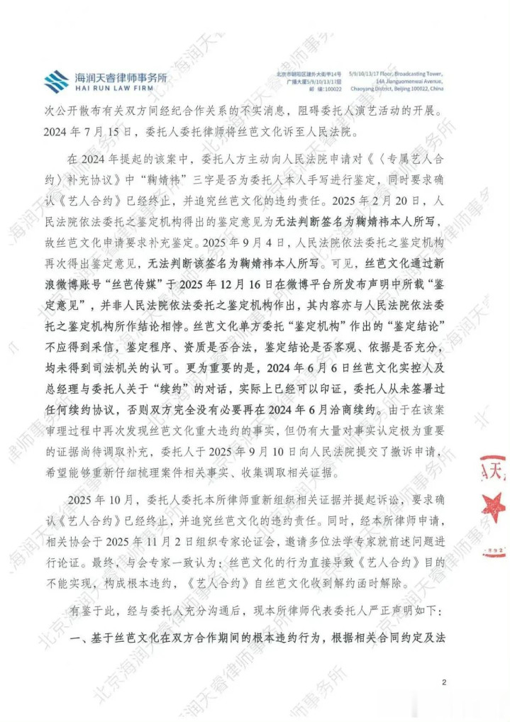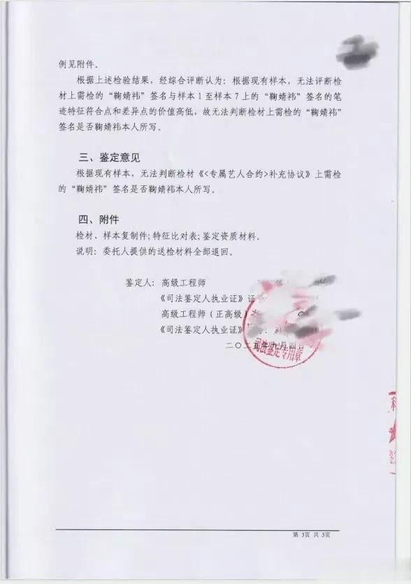 纠纷的根子,在一份说不清道不明的合同上。鞠婧祎方咬定,合约在2024年6月她满30岁时就到期了。公司却说还有一份没到期的《补充协议》。最戏剧性的是,法院委托的鉴定机构两次鉴定,都无法判断协议上“鞠婧祎”的签名是不是本人写的。连签名真伪都成了罗生门,合同本身的公平性更让人画上一个巨大的问号。