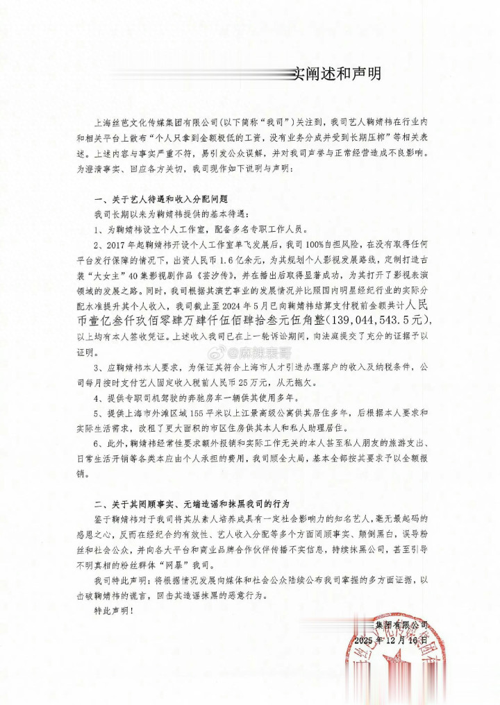 丝芭传媒说自己仁至义尽。他们公布的清单里,鞠婧祎十年间拿到税前收入1.39亿元。这还不算,公司每月固定给她25万元工资,配了带司机的奔驰房车,让她住上海外滩的江景公寓,连她和朋友私人旅游的生活开销都给报销。
