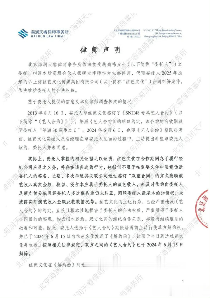 这不是丝芭传媒第一次和旗下艺人闹解约纠纷。屡次发生同类事件,问题可能出在公司的合同模式或管理方式上。鞠婧祎作为曾经的吸金王牌,她的反抗比旁人更有力道。这场官司不管谁赢,都让公众看到了偶像工业光鲜账本背后可能存在的模糊地带。